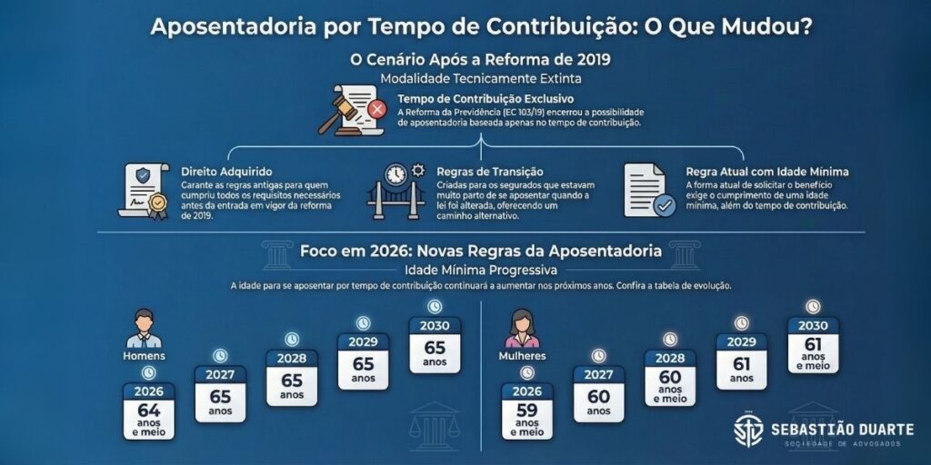 A Emenda Constitucional 103/2019, popularmente conhecida como Reforma da Previdência extinguiu a aposentadoria por tempo de contribuição pura para novos segurados. Em resumo, antes, bastava comprovar 35 anos de contribuição (homens) ou 30 anos (mulheres), independentemente da idade. Agora, quem começou a contribuir após 13 de novembro de 2019 só consegue se aposentar por idade (65 anos para homens, 62 para mulheres) com tempo mínimo de contribuição.